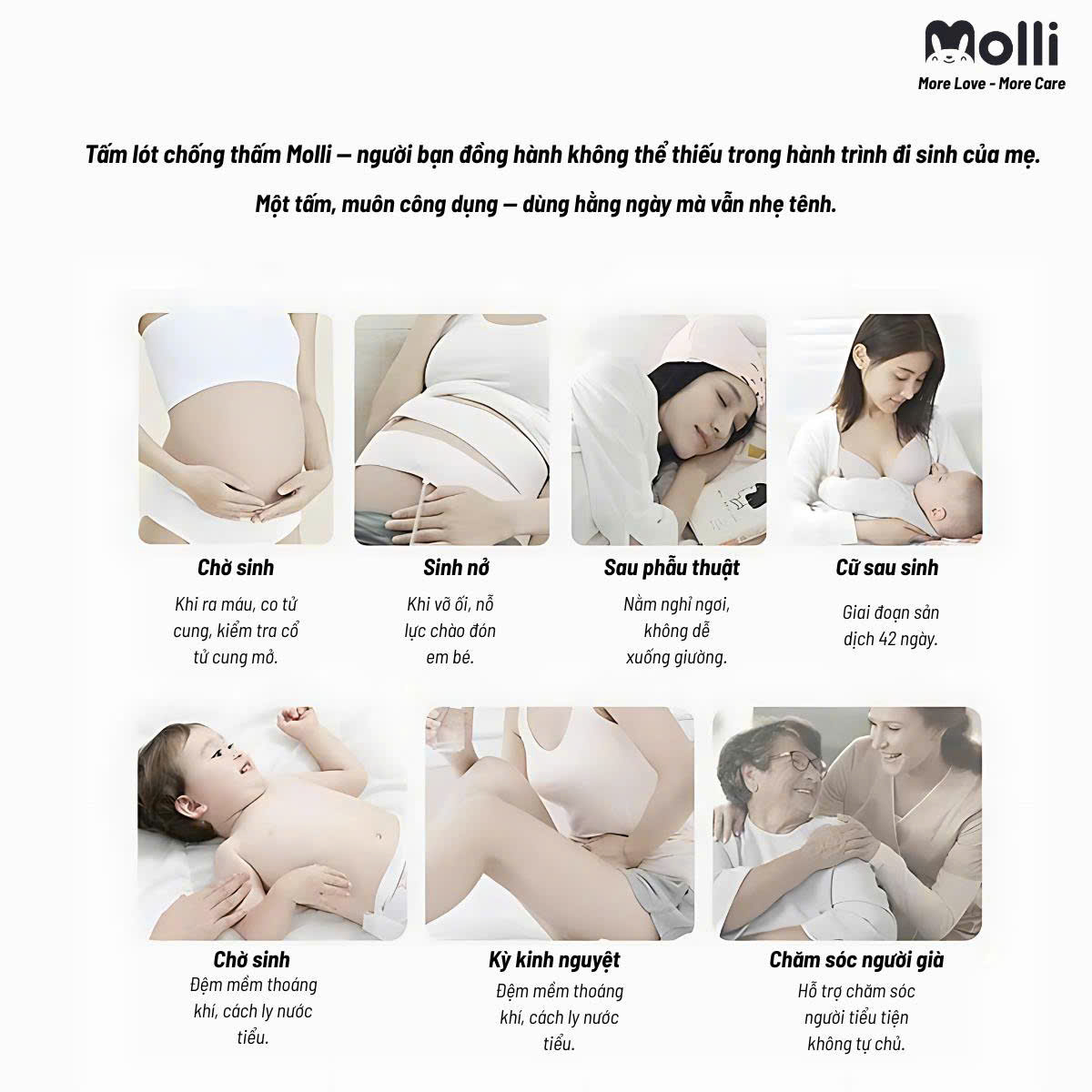 Miếng lót chống thấm Molli là trợ thủ đắc lực chăm sóc các bà mẹ sau sinh và người cao tuổi dễ dàng và khoa học