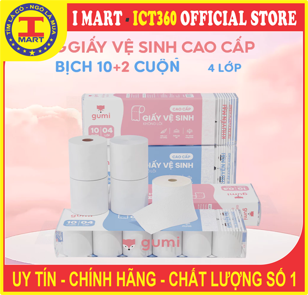 Giấy vệ sinh cuộn 4 lớp bịch 12 cuộn dày dặn cao cấp, không hoá chất tẩy trắng, đảm bảo an toàn khi sử dụng. Gumi thương hiệu Việt bạn có thể an tâm.