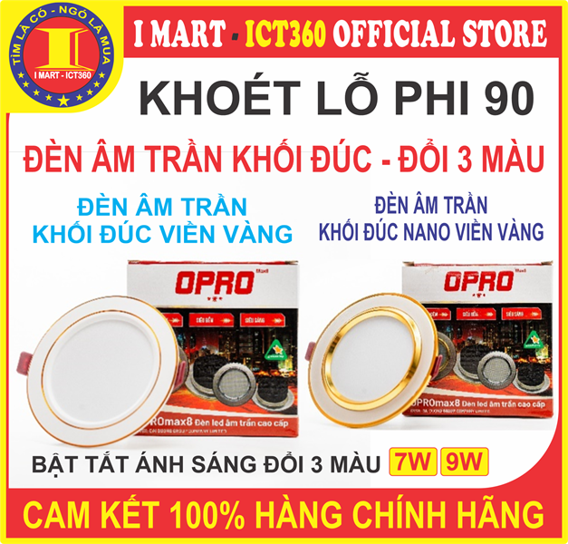 Đèn âm trần khối đúc, khối đúc Nano, Viền Vàng, ánh sáng 3 màu OPRO Max8