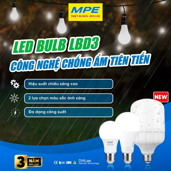 MPE SERI LBD3-NEW (20W-50W) – Với dòng sản phẩm LED Bulb LBD3 (new)nhiều cải tiến vượt trội: chống ẩm, tăng hiệu suất chiếu sáng đến 120LM/W giúp đèn sáng hơn, tiết kiệm điện hơn và đặc biệt với thiết kế nhựa PC cao cấp, chống va đập, chịu nhiệt phù hợp với khí hậu khắc nghiệt ở Việt Nam.