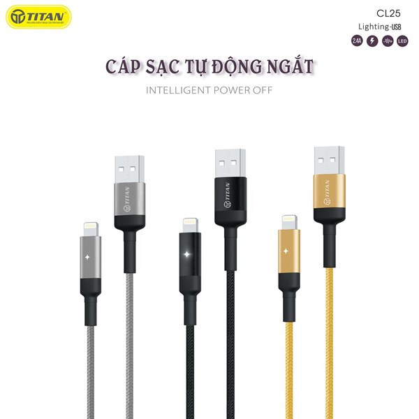 Cáp sạc IPhone tự ngắt 2M Titan CL25 ( Vàng/Đen/Xám)